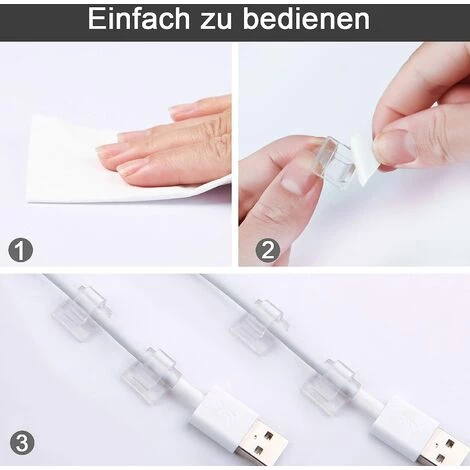 Remarque avant utilisation : assurez-vous que la surface de montage est propre. Pas de saleté, poussière, graisse et cire. Veuillez ne pas insérer le câble immédiatement après avoir collé les clips sur la surface. Le tampon adhésif double face atteint la plus forte adhérence après 24 heures.