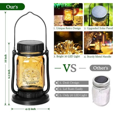 ăLanterne solaire nouvelle versionăLumiĂšres solaires amĂ©liorĂ©es pour bocaux Mason avec motif d’ange, combinĂ©es Ă 30 LED, dĂ©gagent un Ă©clat dorĂ© la nuit pour crĂ©er une ambiance charmante sur votre terrasse ou votre jardin. Vous pouvez Ă©galement bricoler vos lampes solaires d’extĂ©rieur en plaçant des roses, des coquillages, des cailloux, des cactus pour prĂ©senter la beautĂ© diffĂ©rente des lampes solaires. un panneau solaire plus large peut absorber plus de lumiĂšre solaire et assurer un temps d’Ă©clairage plus long, jusqu’Ă 10 heures. S’allume automatiquement au crĂ©puscule et s’Ă©teint Ă l’aube. ăĂtanche et durableă Indice d’Ă©tanchĂ©itĂ© IP65. Ces lampes solaires pour bocaux Mason sont fabriquĂ©es en plastique ABS rĂ©sistant aux chocs et en verre robuste. Et la conception intĂ©grĂ©e du panneau solaire ne permettra Ă aucune humiditĂ© de pĂ©nĂ©trer Ă l’intĂ©rieur, prolongeant la durĂ©e de vie de la lumiĂšre solaire extĂ©rieure.ăLarge applicationăCes lanternes solaires suspendues peuvent ĂȘtre utilisĂ©es pour un mariage, un anniversaire ou une dĂ©coration de NoĂ«l. Vous pouvez le mettre sur vos tables, porches, terrasses ou comme cadeau pour vos enfants, parents et amis. ăExcellent service clientă Si vous avez des questions sur nos lampes dĂ©coratives solaires extĂ©rieures, n’hĂ©sitez pas Ă nous contacter, Nous offrons un service de remplacement d’un an et un service client 24 heures sur 24. Achetez sans souci.