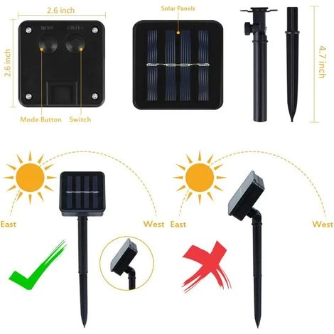 Heures de travail excessives: s’allume de 6 à 8 heures la nuit si le panneau solaire a été chargé pendant 8 à 10 heures pendant la journée. Idéal pour l’éclairage décoratif dans les jardins, les arbres de Noël, les patios, les pelouses, les portails, les cours, etc.