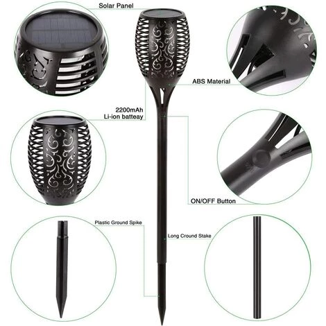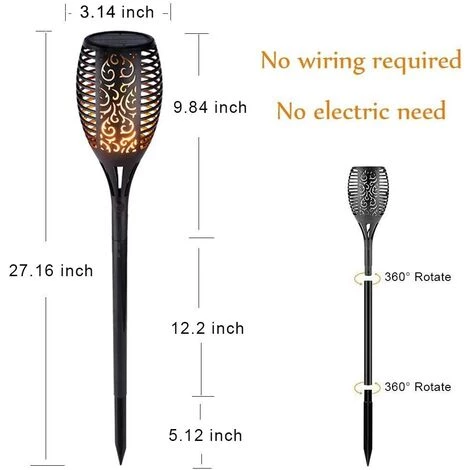 - Lampes solaires pour l’extĂ©rieur : cette lampe torche solaire est une alternative sĂ»re aux vĂ©ritables « flammes ». Offrez une atmosphĂšre de feu de camp parfaite pour votre jardin, fĂȘte, barbecue et camping. Avec deux tubes d’extension, la hauteur rĂ©elle est de 28 pouces.