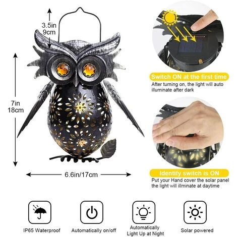 - 【Lanterne solaire à capteur de lumière】 Lanterne à énergie solaire avec capteur de lumière intégré et panneau solaire amélioré, ainsi les lampes solaires Owl se chargeront sous la lumière du soleil et s’allumeront automatiquement dans la nuit noire ou dans des conditions de faible luminosité pour éclairer votre jardin et votre allée . Et puis s’éteint à l’aube. Veuillez vous assurer d’allumer l’interrupteur sur la cellule solaire avant de l’utiliser.