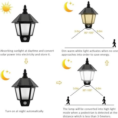 - Deux modes intelligents: Mode d’économie d’énergie — éclairage faible blanc chaud à l’obscurité; Mode d’éclairage plus lumineux — lors de la détection de mouvement, haute éclairage pour vous dans l’obscurité; La lumière ne s’allume que la nuit et s’éteint automatiquement le jour