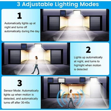 【Capteur Mouvement PIR Sensible】 La lumière solaire avec capteur de mouvement a une distance de détection de 3 à 5 mètres et un angle de détection de 120°. Lorsque les gens approchent, la lumière s’allume instantanément; Lorsque les gens sont partis, la lumière restera allumée pendant 30 à 45 secondes