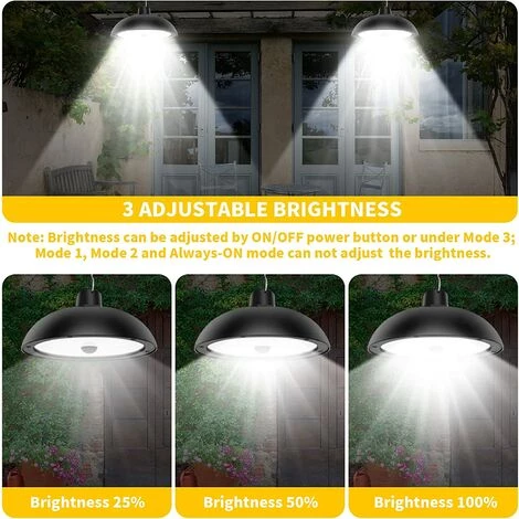 【Lampe à Double Tête de Mise à Niveau】 Le lustre solaire amélioré est équipé de 1 lumières indépendantes, d’un panneau solaire et d’une télécommande. Vous pouvez utiliser la télécommande pour allumer/éteindre 1 lampes solaires individuellement ou ensemble,régler la luminosité (25% / 50% / 100%) et définir différents modes d’éclairage. (Remarque : la télécommande doit pointer vers la tête de lampe, la portée effective de la télécommande : 3 à 5 m).