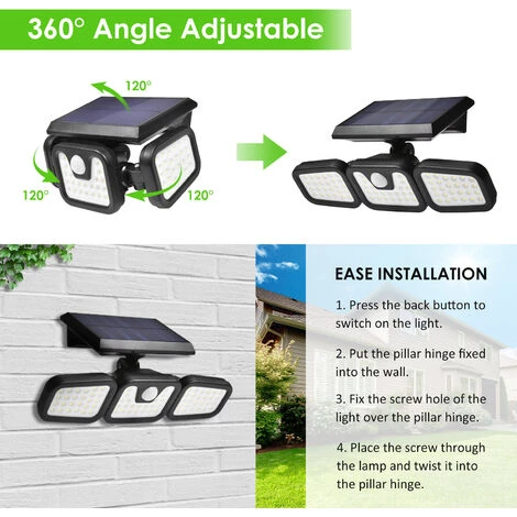 Projecteur rotatif à 74 LED à 360° : la lampe de sécurité solaire à 3 têtes adopte une conception rotative multi-connecteurs, un réglage indépendant à 360° des panneaux solaires et des projecteurs, elle peut être tournée à n’importe quel angle en fonction de vos besoins, offrant une plage de lumière plus large et plus flexible. .
