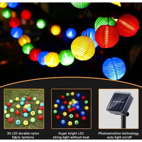Charmantes 30 LED Lanternes Solaires: ces guirlandes solaires sont livrées avec 30 lanternes, la longueur totale est de 6.5m. Fabriqués en tissu de nylon de haute qualité, ils ont de bonnes performances imperméables et une résistance élevée à la pression. Leur flexibilité et robustesse les rendent ne s’abîment pas facilement. Ne manquez pas l’occasion de les laisser vous éclairer et d’y ajouter une ambiance chaleureuse et romantique!
