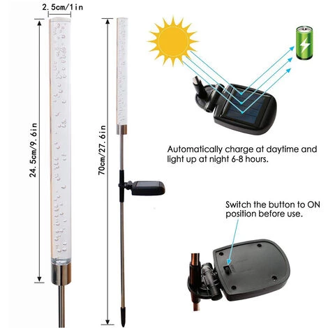 Spécifications: Quantité: 1PC, 2PCLongueur totale: 70CM / 27,6 poucesSource alimentée: Type d’ampoule à énergie solaire: LED Temps de charge: 4-5 heures (lorsque la lumière du soleil est suffisante) Temps de travail: 6-8 heures Conseils avant utilisation: s’il vous plaît allumez l’interrupteur pour vous assurer que la lumière peut être chargée efficacement à la lumière du jour.