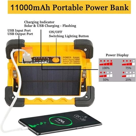 [Power Bank & Emergency Light] La lampe de chantier solaire d’urgence à projecteur LED rechargeable peut être une banque d’alimentation avec 4 batteries rechargeables lithium-ion 18650 intégrées (incluses) (grande capacité: 11000mAh). Il est pratique pour charger les appareils mobiles et convient à l’éclairage dans n’importe quelle scène d’urgence.[Lampe de travail solaire et rechargeable par USB] La lampe de travail solaire portable est alimentée par un panneau solaire en silicium monocristallin et est complètement chargée au soleil pendant 6 à 12 heures. Même dans des conditions de faible luminosité, la lampe peut être chargée. Ou il peut être complètement chargé en seulement 3 heures via un câble USB.[4 modes d’éclairage et étanche] La lampe architecturale à LED portable étanche est équipée de 70 douilles à LED, 4 modes d’éclairage : haute luminosité, luminosité moyenne, faible luminosité, stroboscope rouge/bleu (mode SOS), durée d’éclairage : 8 -36 les heures. Le matériau étanche IP65 le rend performant dans la nuit sauvage et pluvieuse.[Poignée rotative à 180 ° et base magnétique] Vous pouvez régler l’angle d’éclairage approprié grâce à la poignée réglable de la lampe de travail. La puissante base magnétique peut être fermement collée sur n’importe quelle surface métallique, libérant ainsi vos mains.