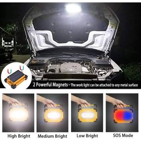EINEMGELD Projecteur LED Rechargeable Lampe Chantier Solaire 60W, 4 Modes Portable LED Lampe De Travail Étanche USB Banque D’alimentation Avec Aimant Pour Réparation De Voiture, Randonnée, Camping, Urgence