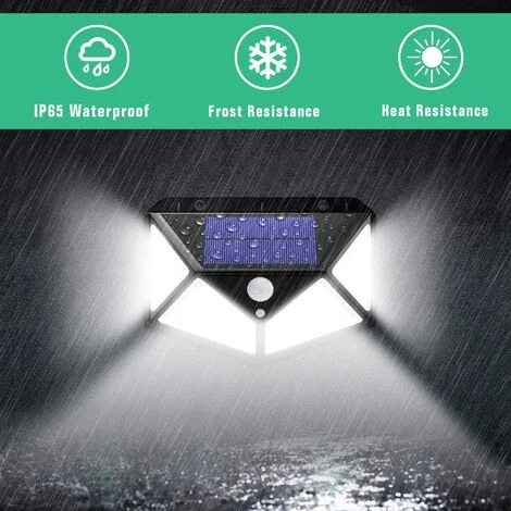 【Lumière Solaire étanche IP65】La lumière solaire est conçue pour l’utilisation en éxtérieur et fabriquée en plastique ABS, elle est donc imperméable et résistante à la chaleur. Même si en hiver glacial ou en été brûlant, la lampe solaire 100 led peut être chargée par soleil et fonctionner normalement.