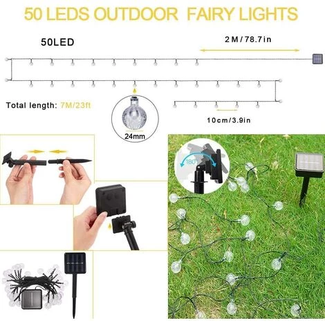 50 boules de cristal LED ultra-lumineuses: 50 boules de cristal de haute qualité d’un diamètre de 2,5 cm rendent la guirlande lumineuse solaire plus lumineuse, très adaptées à la décoration des maisons, des clôtures, des jardins, des balcons, des fenêtres et des arbres de Noël, créant une atmosphère idéale pour toutes vos célébrations.
