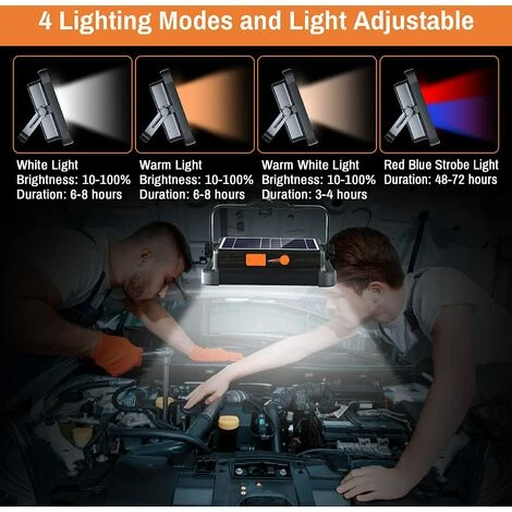 【4 MODES D’ÉCLAIRAGE ET LUMIÈRE RÉGLABLE】: Le projecteur LED rechargeable est équipé de 336 LED, ainsi que sa puissance de 100W, en font un outil très utile dans les endroits sombres, à l’intérieur comme à l’extérieur, idéal pour le camping ou les travaux de nuit. Ses 4 modes d’éclairage, blanc, chaud, blanc et chaud, et son signal SOS, lui confèrent une polyvalence difficilement égalable par d’autres produits similaires. Et appuyez longuement sur l’interrupteur pour régler l’intensité lumineuse