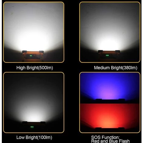 60W 3000LM Super Brillant et 4 modes d’éclairage: Projecteur led rechargeable lampe chantier batterie a 4 modes d’éclairage: Clair- Moyen- Foncé – Clignotant (LED bleues et rouges clignotantes). Appuyez sur le bouton mode pour transformer rapidement le mode entre différents types d’éclairage.