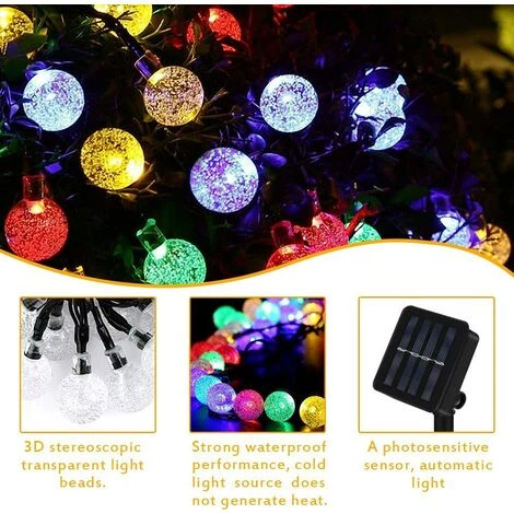 - Cette guirlande lumineuse d’extérieur solaire comprend 100 lumières LED colorées d’une longueur totale de 12 mètres. Le câble est doux et flexible, vous pouvez donc attacher la chaîne dans la position souhaitée sans aucun problème.