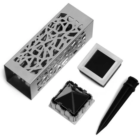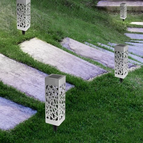 Descriptif du lot de 10 lampes solaires MOLLYQu’elles soient plantées dans votre jardin ou simplement le long de votre terrasse, ces 10 bornes solaires seront du plus bel effet ! Avec leur design ajouré moderne, vous pourrez illuminer vos extérieurs en un rien de temps. Chaque face des lampes est ajourée de manière à projeter une lumière façon ombres chinoises pour une atmosphère tout en douceur. Vos extérieurs seront donc illuminés et cela avec goût et modernité. Ce lot de 10 lampes ajourées est un élément de décoration incontournable pour votre jardin ! Facile à positionner, disposez-les en bordure de terrasse grâce aux piquets fournis et profitez d’une ambiance agréable et tendance. Équipées d’un panneau solaire intégré, les lampes solaires s’illumineront automatiquement dès la tombée de la nuit : ambiance chaleureuse garantie !Dimensions du lot de 10 lampes solaires MOLLY- Dimensions hors tout : Longueur 6 cm x largeur 6 cm x Hauteur (avec piquet) 29 cm- Hauteur d’un piquet : 11 cm- Dimensions du panneau solaire : 4 x 4 cm- Structure en plastique- Couleur argentée- Lampes solaires à planter- Batterie solaire – Fonctionne avec piles rechargeables AA – NiMH – 1.2V – 100 mAh- Panneau solaire 2V – 35 mAh- LED blanche