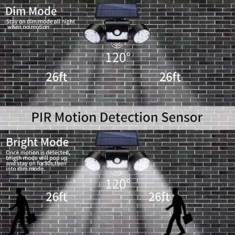 - Le projecteur solaire extérieur peut détecter les personnes dans un rayon de 25 mètres sous un angle de 120 degrés. Batterie lithium-ion rechargeable de 2200 mAh (mode gradation et capteur), allume pendant 30 secondes après la détection de mouvement puis assombrit (mais elle ne éteint pas, elle se charge automatiquement pendant la journée, veuillez tenir le panneau solaire complètement exposé à light)