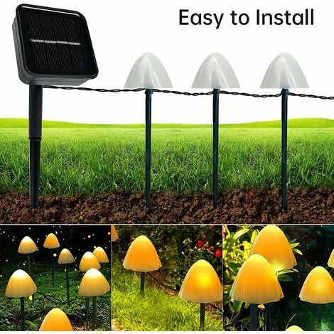 【8 Modes】 Nos lampes solaires champignon ont 2 boutons d’interrupteurs (Power ON / OFF, mode changeant). Vous pouvez sélectionner 8 modes différents, y compris la combinaison, les lucioles clignotantes, les vagues, la décoloration, la poursuite, la décoloration lente, le scintillement et la stabilité, crée 8 effets d’éclairage fascinants et vifs.