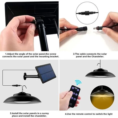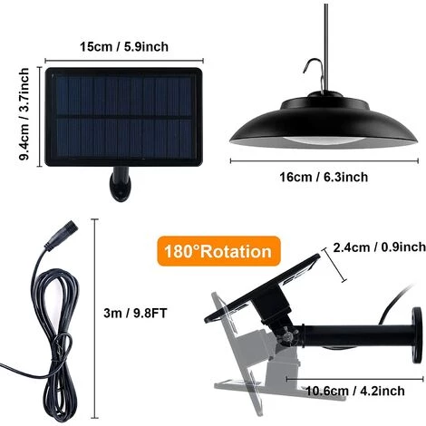 【Conception séparable】 La lampe solaire est composée de deux parties, une suspension et un panneau solaire, reliés par un câble qui s’étend jusqu’à 3 m. Avec cette conception, la lampe peut être installée n’importe où tant que le panneau solaire est installé là où il peut absorber la lumière du soleil.