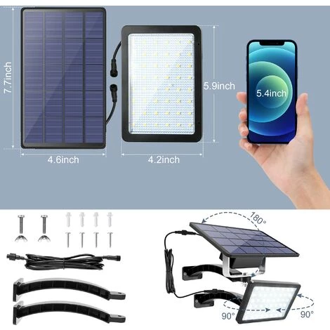 Dimensions du produit. Panneau solaire 19,7 cm/7,76 pouces de long, 11,7 cm/4,61 pouces de large, applique murale 15×10,7x20cm/5,91×4,21×7,87quot;, câble d’extension 3m