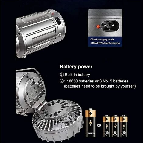 - 3.? ?Fonctions multiples? Cette lampe à ventilateur électrique rétractable est très puissante. Premièrement, il peut être utilisé pour l’éclairage et sa forte lumière est très adaptée à une utilisation en extérieur ; deuxièmement, le ventilateur haute puissance peut être utilisé simultanément avec la lumière ; il peut également être utilisé pour le chargement. Il existe une interface USB, qui prend en charge certaines charges de téléphone portable à faible mA.