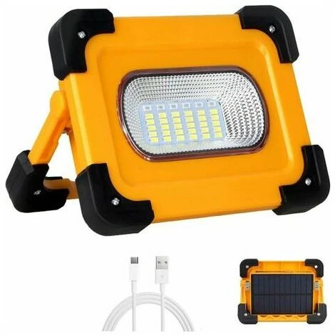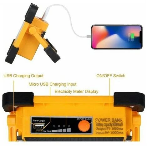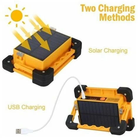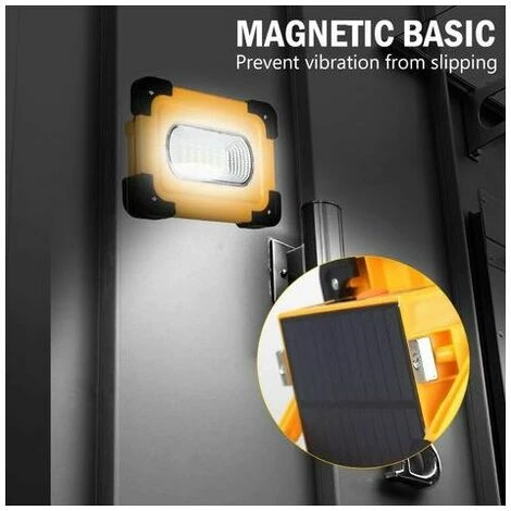 Rechargeable par USB et alimenté par énergie solaire: Projecteur LED rechargeable eclairage batterie Projecteur Chantier une batterie rechargeable intégrée de pourrait remplacer l’éclairage du plafond en cas de panne de courant. La lampe de travailà LED extérieure avec panneau solaire peut être chargée directement du soleil, ainsi que via le port de charge.175*135(mm)