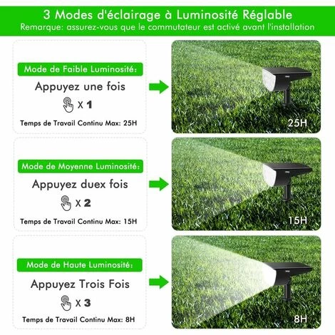 【3 Modes d’Éclairage】Cette lampe solaire de jardin ont 3 modes pour stisfaire divers besoins: ① mode de faible luminosité ( 25 h), ② mode de moyenne luminosité (15 h), ③ mode de haute luminosité ( 8 h). Et la lampe peut détecter automatiquement le changement