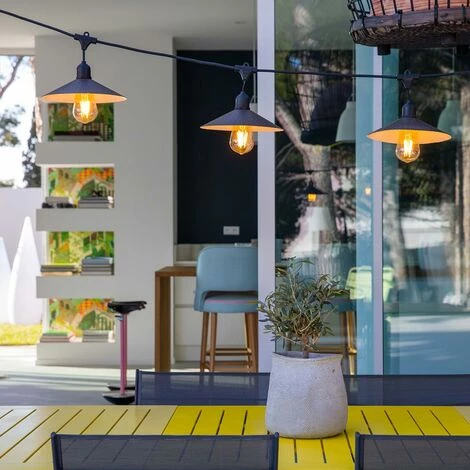 - GUIRLANDE SOLAIRE LUMINEUSE E27 : VINTY LIGHT SOLAR est une guirlande solaire lumineuse à ampoules E27 à filament qui disposent de passants pour pouvoir la suspendre à votre gré. Cette guirlande lumineuse LED avec abat-jour en acier se distingue par son design à la fois rétro et tendance. Elle est idéale pour faire briller vos soirées et vous allez adorer son côté design et vintage pour illuminer vos plus beaux événements.