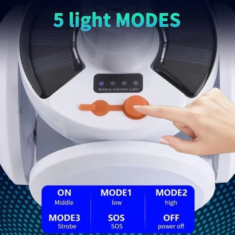 2 modes de charge : USB/DC charge et solaire charge. Lorsque la lampe est completement chargee, elle fournit une lumiere stable apres l’extinction. Les batteries integrees de 2400 mAh sont chargees pendant 6 a 20 heures sous un eclairage et une lumiere normaux.