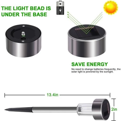 - INSTALLATION FACILE: Très facile à assembler et à placer dans le sol. Le dessus lumière / solaire a un bouton marche / arrêt en dessous, il suffit d’allumer l’interrupteur, de retirer le piquet du piquet (le pieu est caché dans le tube métallique) et de le retourner