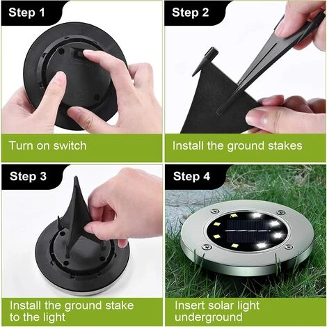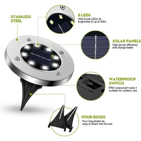 【Facile à Installer】:- En cours d’utilisation, allumez simplement l’interrupteur des lampe solaire exterieur et insérez-le dans le sol. Les lampes solaires souterraines s’allument automatiquement la nuit et s’éteignent automatiquement pendant la journée!