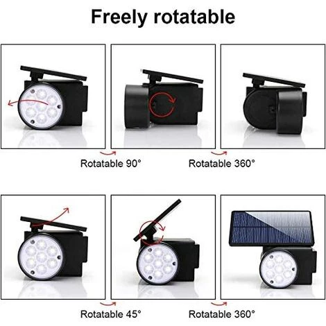 Panneau solaire et projecteurs rotatifs à 360 degrés: Les lampes solaires extérieures peuvent être tournées indépendamment et de manière flexible pour ajuster l’angle que vous souhaitez.