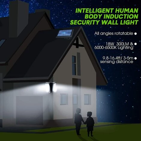 Amélioration de 90 LED lumineuses: la lumière solaire étanche est livrée avec 2 têtes de lampe réglables, un éclairage grand angle 3D et une zone d’induction rotative améliorée à 360 degrés, détecte les mouvements jusqu’à 16,5 pieds/ 5 m, une plage de distance plus longue et un grand angle pour la détection de mouvement meilleure sécurité pour la famille
