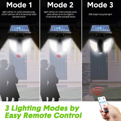 Éclairage du panneau solaire télécommandé: la lumière à induction du corps humain peut être contrôlée par la télécommande pour 3 modes d’éclairage, comprend 2 modes de détection et 30% de dernier mode de luminosité, une fois la lampe réglée, pas besoin de la démonter pour les modes changeant avec le télécommande