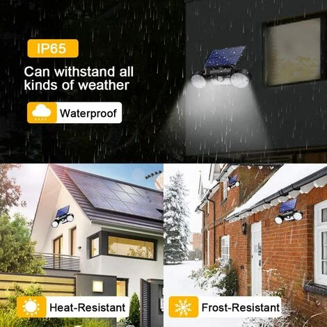 IP65 étanche et haute efficacité: spots solaires sans fil de jardin étanche IP65. Convient à toutes les conditions météorologiques. Aide les lampes solaires à détecteur de mouvement extérieur à bien fonctionner même sous de fortes pluies, des tempêtes de neige et d’autres conditions météorologiques difficiles. Le panneau solaire est plus économe en énergie et avec un panneau solaire stratifié PET et des lumières LED d’extérieur de qualité supérieure.