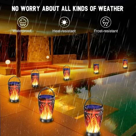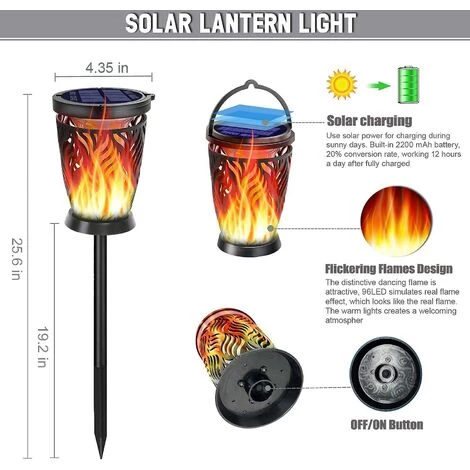 Étonnante lampe solaire à flamme clignotante : Cette lampe de poche solaire à flamme peut remplacer en toute sécurité la véritable « flamme ». 96 lumières LED émettent une lumière sûre, douce et émotionnelle dans la lumière, fournissant une atmosphère de feu de camp parfaite pour votre cour, jardin, fête, barbecue et camping.