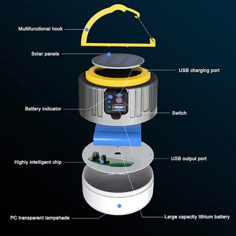 【Panneau de charge solaire】Cette lampe de camping se charge non seulement via USB, mais dispose également d’un chargeur solaire. Il peut être alimenté à tout moment par le courant solaire, pour répondre aux besoins d’éclairage extérieur ou alimenter les téléphones portables.
