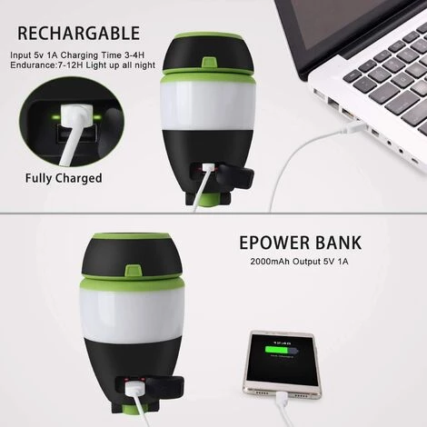 La lanterne de camping portable avec batterie rechargeable de 2000 mAh, chargĂ©e par port USB, cette lanterne de camping peut Ă©galement servir de bande d’alimentation pour votre tĂ©lĂ©phone ou vos appareils mobiles en cas d’urgence