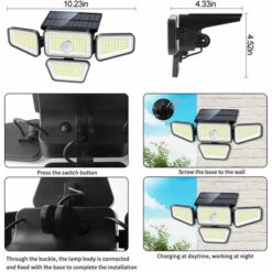 Lampes Solaires Extérieures, 270 LED 3000LM Détecteur De Mouvement IP65 Étanche 4 Têtes 3 Modes 6500K Énergie Solaire Sécurité LED Projecteurs Sans-Macaron
