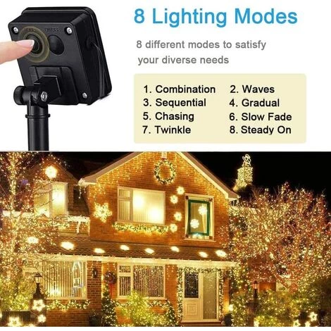 - 【8 modes de travail】 8 modes de travail satisfont votre humeur différente, y compris 1 mode stable et 7 modes scintillants. Les guirlandes solaires donneront à votre lieu une lueur ambrée chaude étoilée, avec le bouton de changement de mode, vous pouvez créer l’atmosphère que vous souhaitez.