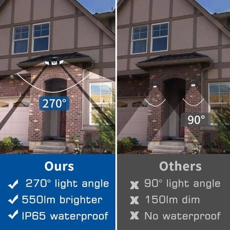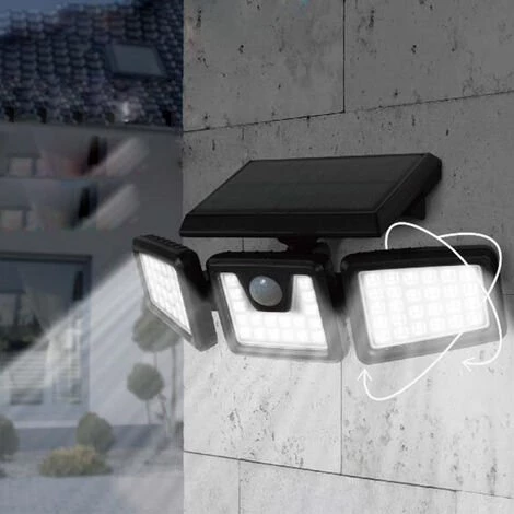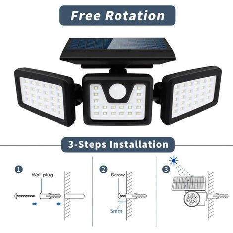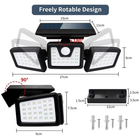 1. Ce puissant projecteur solaire est équipé de 3 têtes de lampe orientées verticalement ou horizontalement, vous permettant d’éclairer indépendamment les entrées, les passages sombres, les cabanes ou les serres de jardin avec 2 angles d’éclairage solaire différents