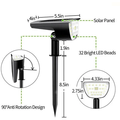 Solaire super lumineux : le projecteur solaire est composé de 32 lumières LED, ce qui est plus lumineux que les autres lumières LED dans l’obscurité. À l’aide d’un capteur de lumière intégré, notre lampe solaire s’éteindra automatiquement et chargera la batterie pendant la journée, puis allumera la lumière et éclairera votre route dans l’obscurité, sans avoir besoin de câbles et d’électricité.
