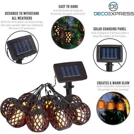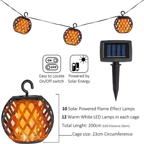 GUIRLANDE LUMINEUSE EXTERIEURE EFFET FLAMME: cette guirlande exterieure apportera une atmosphère magique à votre jardin. Cette lampe solaire exterieur jardin décorative peut être attachée sur un mur, un arbre, une pergola, une tonnelle ou sur une cabane du jardin et la flamme vacillante apportera une ambiance vraiment sympa qui impressionnera vos invités