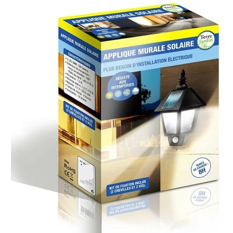 - Nul besoin d’installation électrique, un panneau solaire situé sur le dessus du luminaire recharge la batterie au contact de la lumière du soleil. Temps de charge estimé entre 8 et 12 heures pour un temps d’éclairage de 6 heures. Équipé d’un capteur de lumière, cette applique solaire murale s’allume automatiquement à la tombée de la nuit.