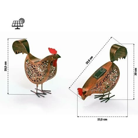 - Ces poules lumineuses solaires vous séduiront par la touche de féerie qu’elles apporteront à votre extérieur. Leurs découpes baroques (sur le côté des poules) dessineront au sol de jolis motifs à formes géométriques.