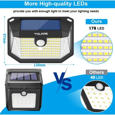 1, 2022 Nouvelle version 178 lampes solaires à LED : cette lampe solaire d’extérieur à capteur de mouvement a l’apparence la plus unique sur le marché, un éclairage grand angle à 270°, avec 178 LED, couvre beaucoup plus de zone d’éclairage. L’abat-jour complètement transparent et la plaque arrière spéciale assurent de meilleurs effets d’éclairage. Cela signifie que notre lampe solaire à détecteur de mouvement est plus lumineuse et plus pratique que d’autres lampes solaires similaires sur le marché.