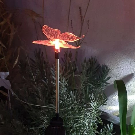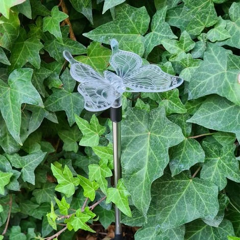 Piquet « Papillon » LED solaire Multicolore (RVB), aux finitions en plastique et silicone au style moderne. Grâce à son extrémité pointue, ce produit solaire se fixe très facilement dans la terre tout en ayant une stabilisation optimale.